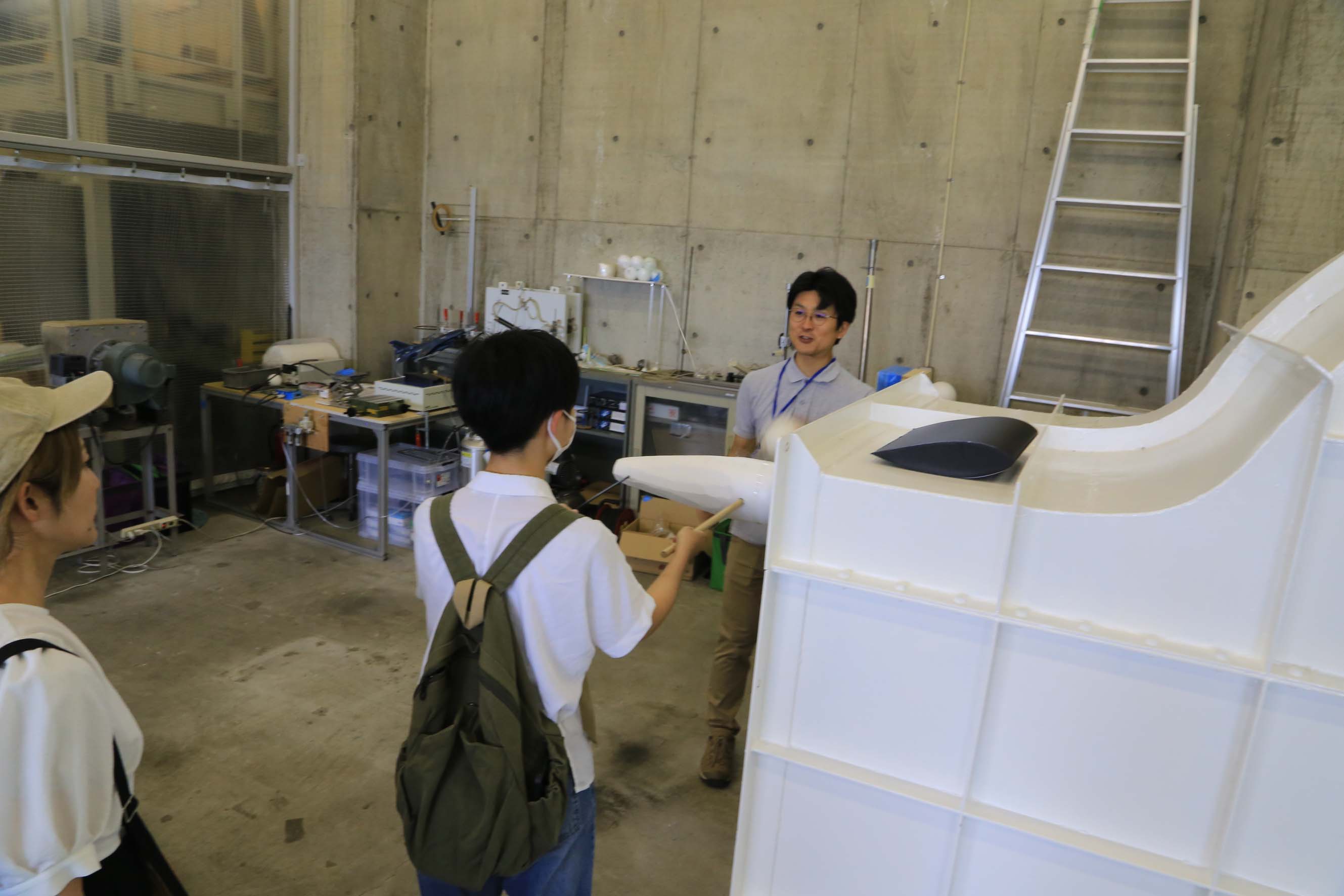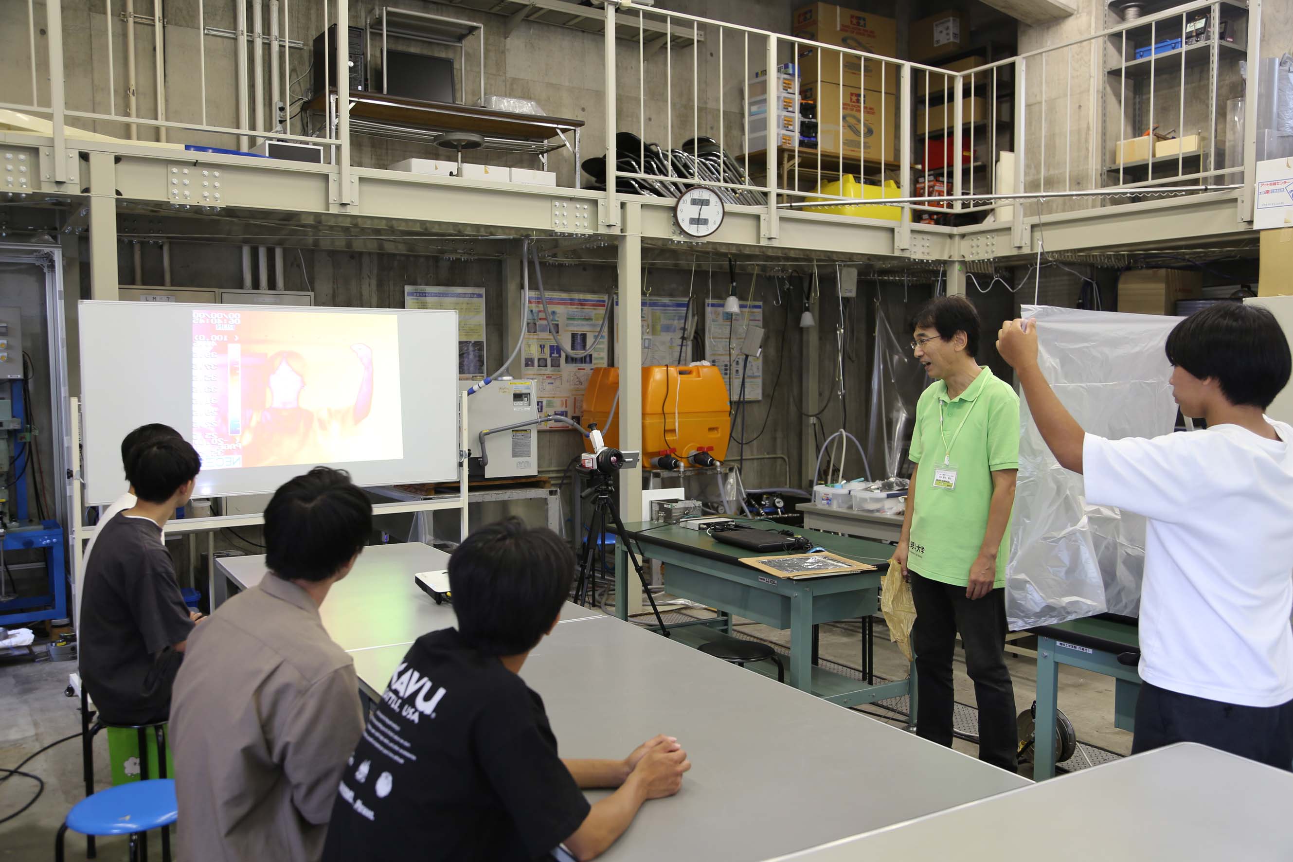 大型風洞での空力実験,ガラスエンジンの発火実験,赤外線カメラを使った伝熱実験など,熱と流れの研究に欠かせない実験を体験していただきました.