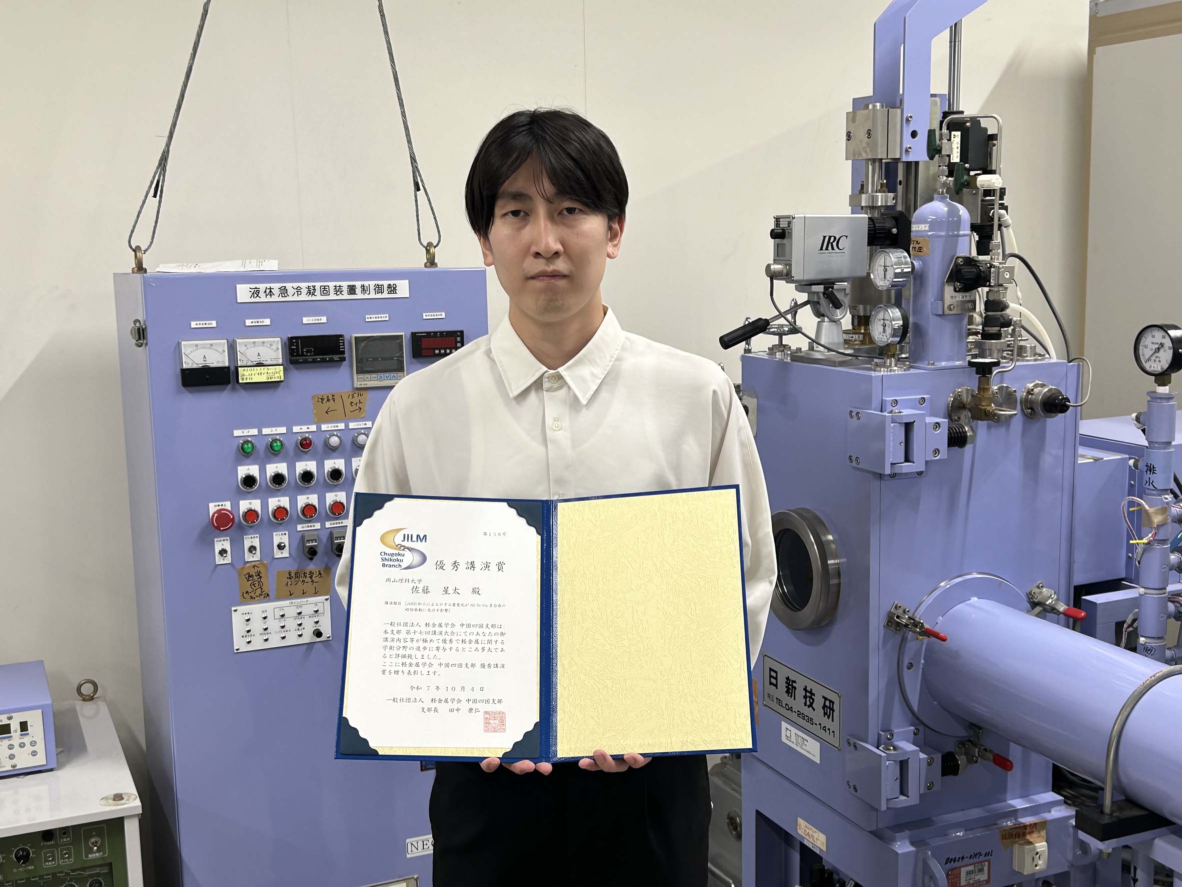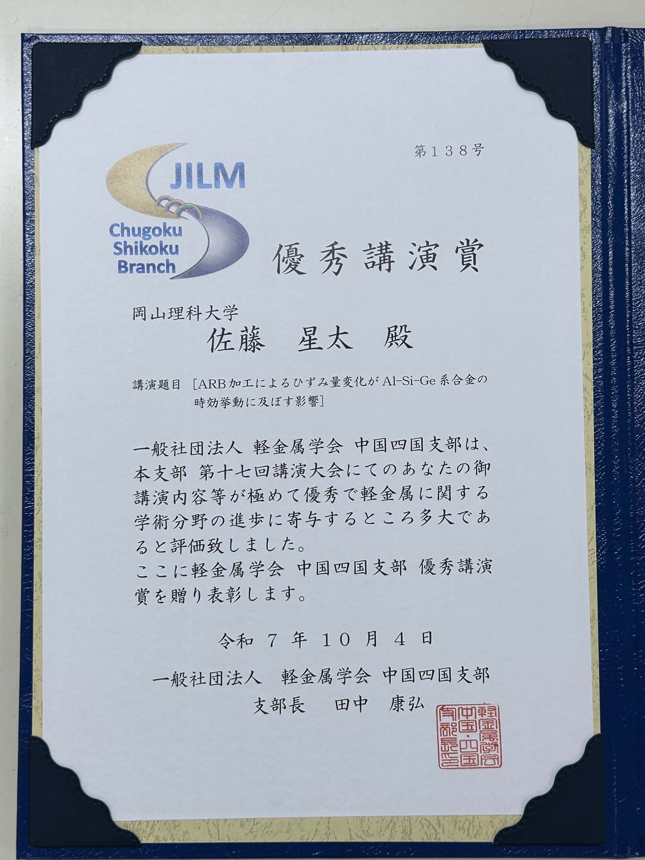 大学院生が軽金属学会中国四国支部優秀講演賞を受賞!(掲載日:2025年10月14日)