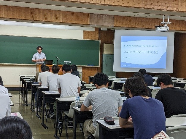 機械システム工学科では,毎年,学科独自の就職ガイダンスを年に3回程度実施しています.6月3日(火)には,本年度第2回目となるガイダンスを.3年生および大学院1年生を対象に開催しました.今回は,株式会社フォーラムエンジニアリングより講師をお招きし,ご自身の実体験を交えながら,エンジニアの仕事内容についてご講演いただきました.講演では,機械系エンジニアの今後の需要動向についてのデータを基にした解説に加え,エンジニア職に特化した就職活動の進め方についても詳しく説明があり,非常に実践的な内容となりました.参加した学生たちは皆,熱心に耳を傾けており,多くの有益な情報を得られたのではないかと思われます.今後も学科として,さまざまな形で独自の就職支援を継続してまいります.